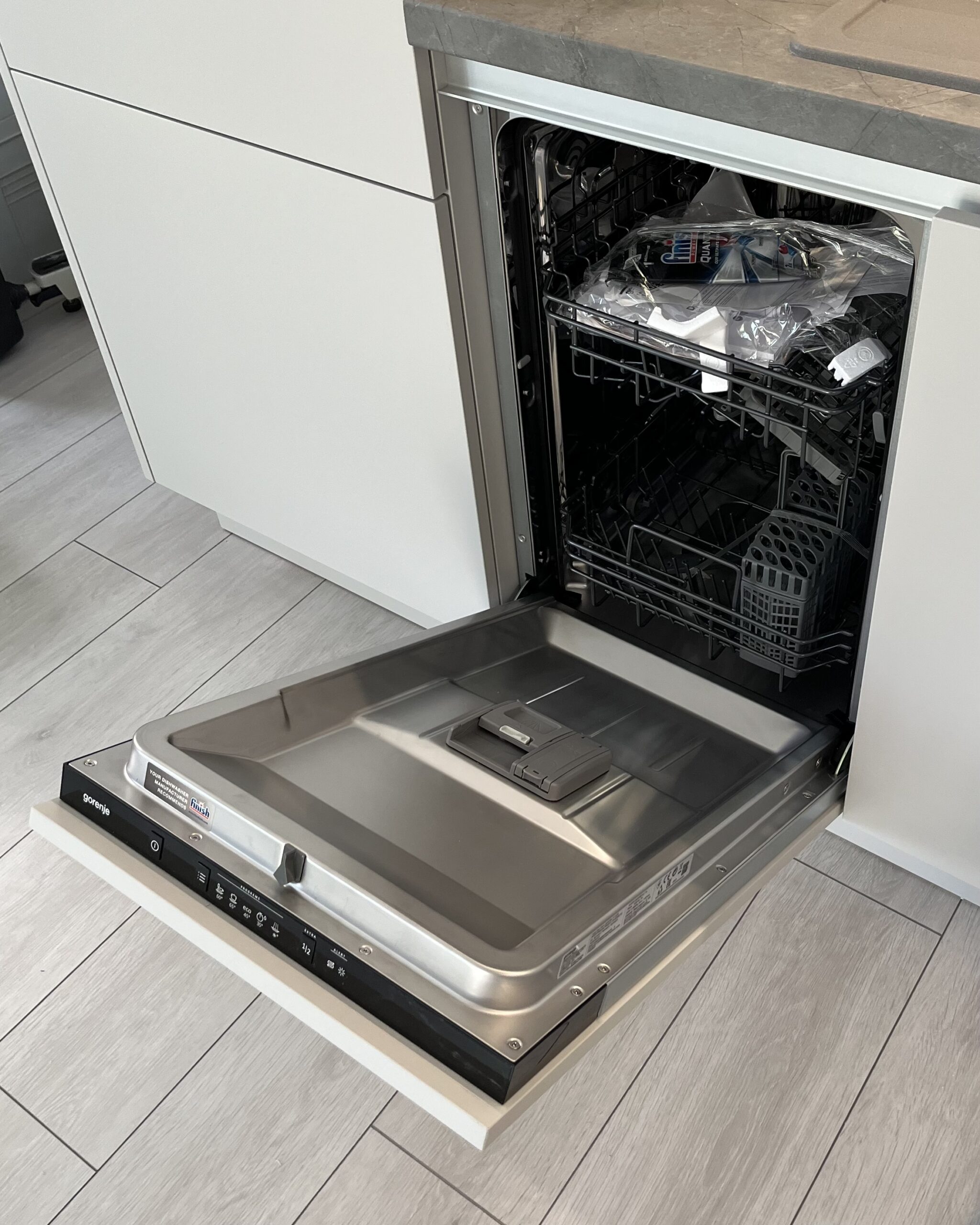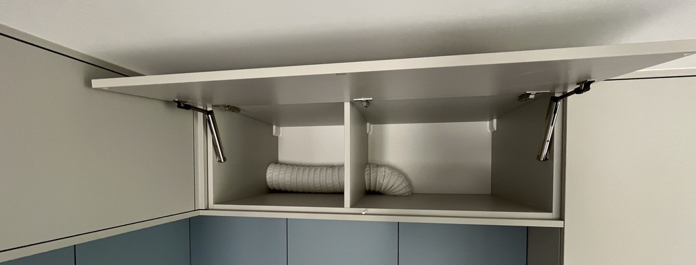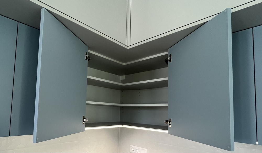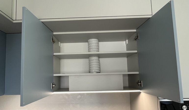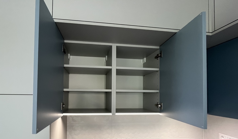 A felső ajtó Blum Tip-On nyitással készült. A hűtőajtónál oldalba mart